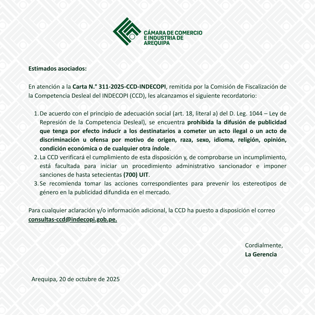 Trabajamos en el incremento de la competitividad entre empresas, representándolos, defendiendo sus intereses gremiales e impulsando su desarrollo y en consecuencia el desarrollo de Arequipa.